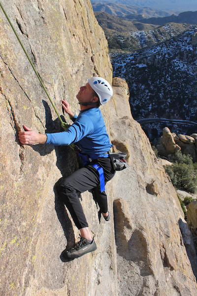 Guide Aaron Mike belaying client Rob Rooks up the 2nd pitch of Endgame 5.10, Cochise Stronghold.