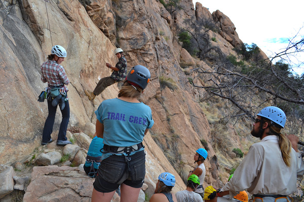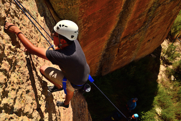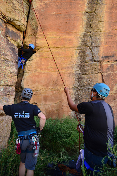 Day 1 took place on August 30, 2015 and we could not be happier with the turnout, strength, and motivation demonstrated by the students. Students learned the current state of rock climbing through lecture of historical events and different styles of the sport with demonstrations from PMG guides. Leave No Trace ethics and Erosion Control were emphasized by both PMG and the Southwest Conservation Corps while the students practiced technical climbing skills at Mentmore Climbing Area. PMG is very grateful to have the privilege to instruct this group of young people and work with the Southwest Conservation Corps to make every class a complete success. Thanks again to all who made this amazing event possible! Take a peak at the photos from Day 1 and check back for more updates from Mentmore!